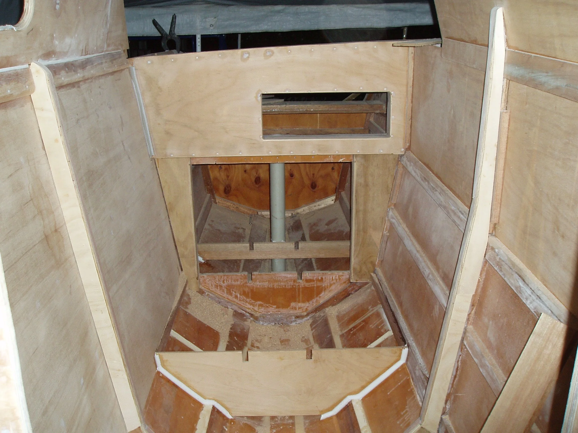 starting the interior lounge fitout, at this point i have been working on the boat for approximately 9 mths, you can also see the start of the kitchen storage shelves down in the hull
