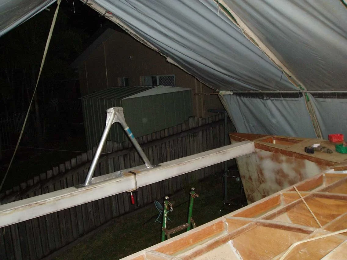 Christmas has arrived and we are 1 year and 3 mths of part time boat building in, so many new skills have been learnt, knocking up shapes with timber and epoxy has become child’s play, there are many ways to support a dinghy on a boat and for me personally a targa bar makes a catamaran look amazing, some design innovation resulted in what turned into something that looked great, supported the four 60 watt solar panels i purchased in out of the way location, lifted the dinghy out of the water with ease and provided a few extra hand holds around the place. I was hoping to get all of the decks on prior to the wet season and a brief shutdown over Christmas but it wasn’t quite to be.